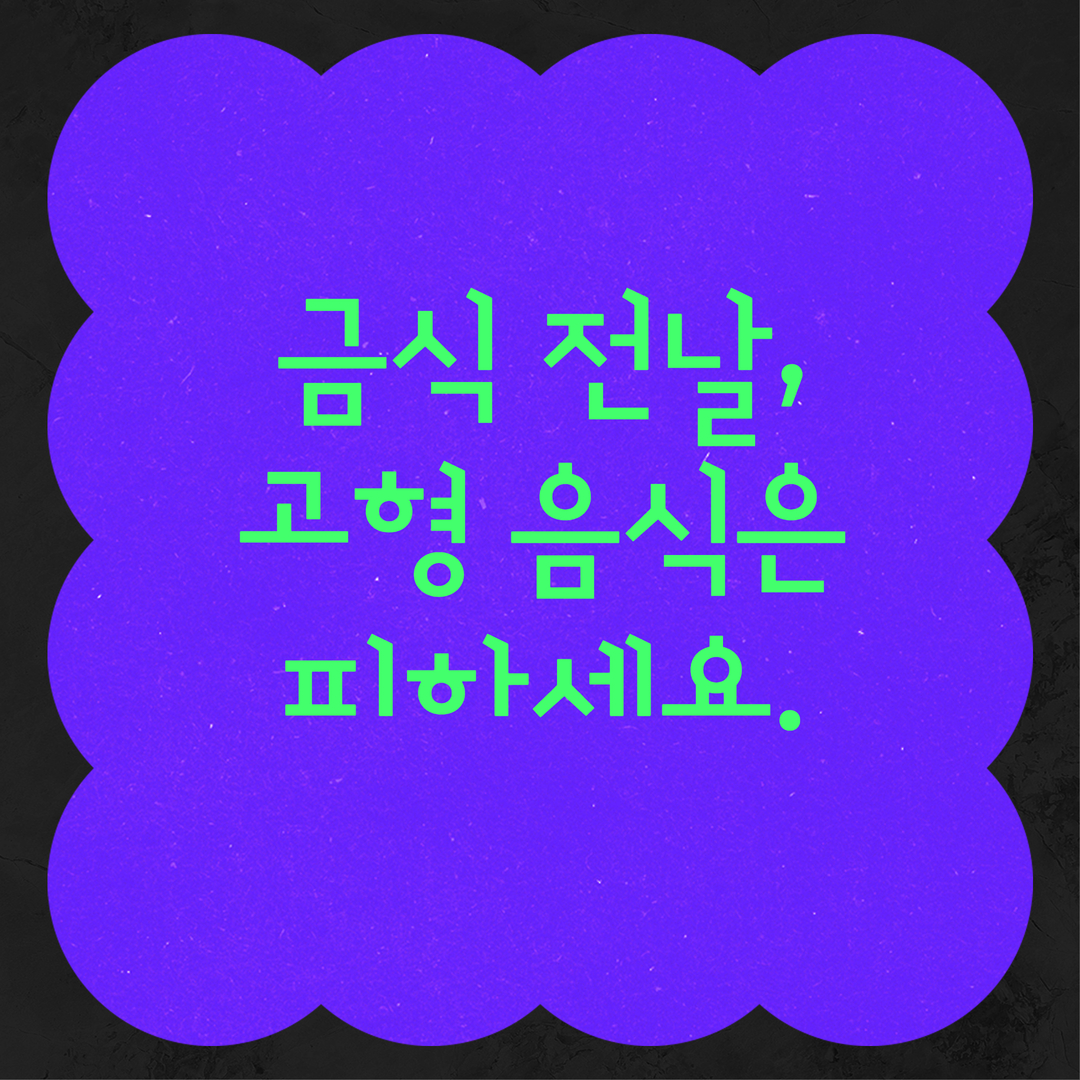 이때 중요한 건 가벼운 식사를 한 뒤, 저녁부터 금식을 시작하는 것입니다. 즉, 고형 음식을 섭취한 후 3~4시간 이내에 금식을 시작해야 하며, 그 이후에는 오직 맑은 음료만 마셔야 합니다.