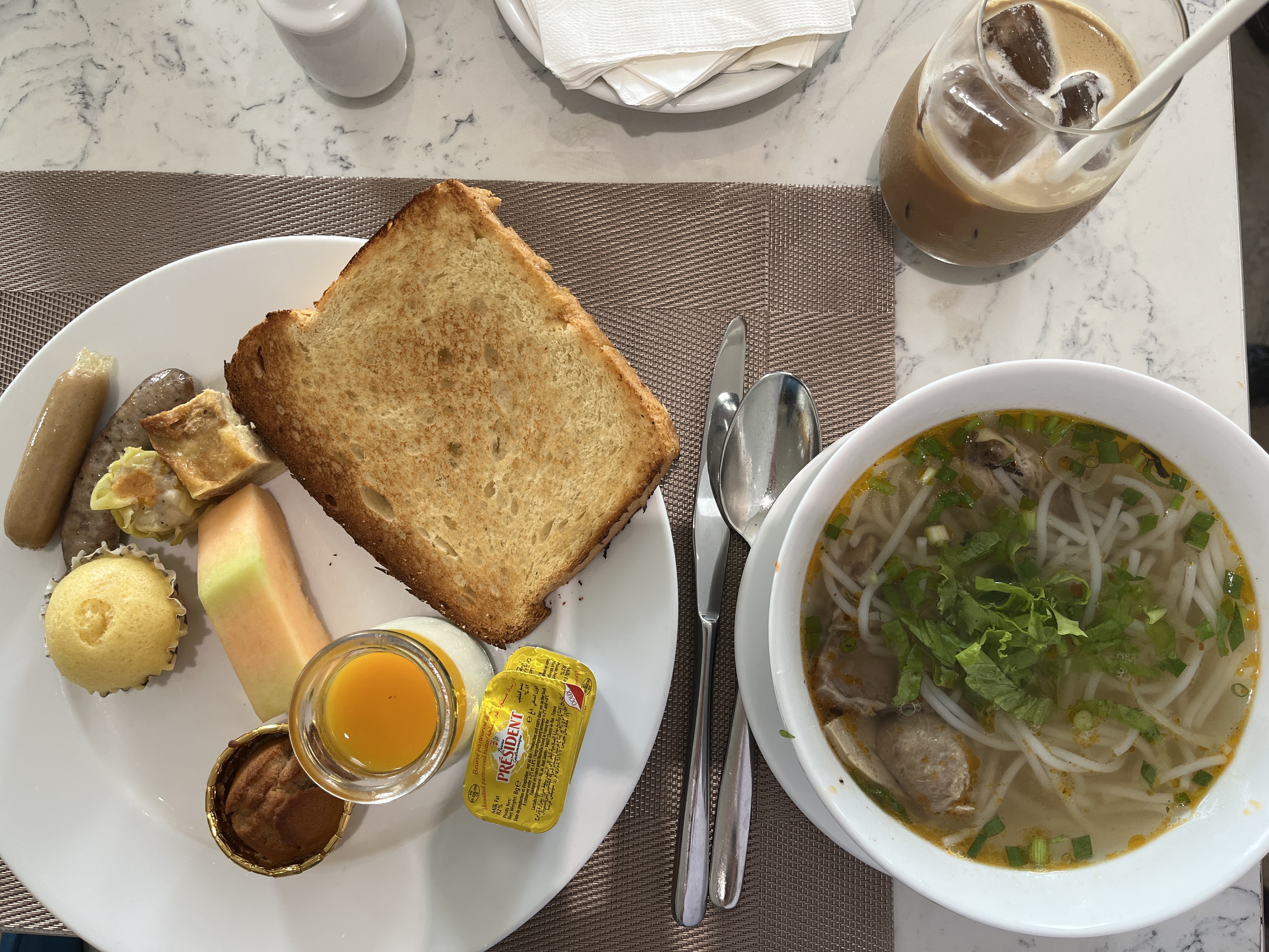 라벨라 호텔 조식은 무료여서 먹으러 갔습니다. 저희는 8시 넘어서 조식을 먹으러 갔는데도 사람들이 거의 꽉 차 있었습니다. 아침에는 입맛이 별로 없어서 조금 먹은 편이었는데 라벨라 사이공 호텔 조식을 먹은 후부터 설사가 시작되었습니다. 커피가 맥심 커피 맛 비슷했는데 두잔을 먹어서 그런 게 아닌가 짐작해 봅니다. 메뉴는 많았는데 먹을만한 게 많지는 않아 토스트와 과일 위주로 먹었습니다. 쌀국수는 맛이 별로여서 남겼습니다.