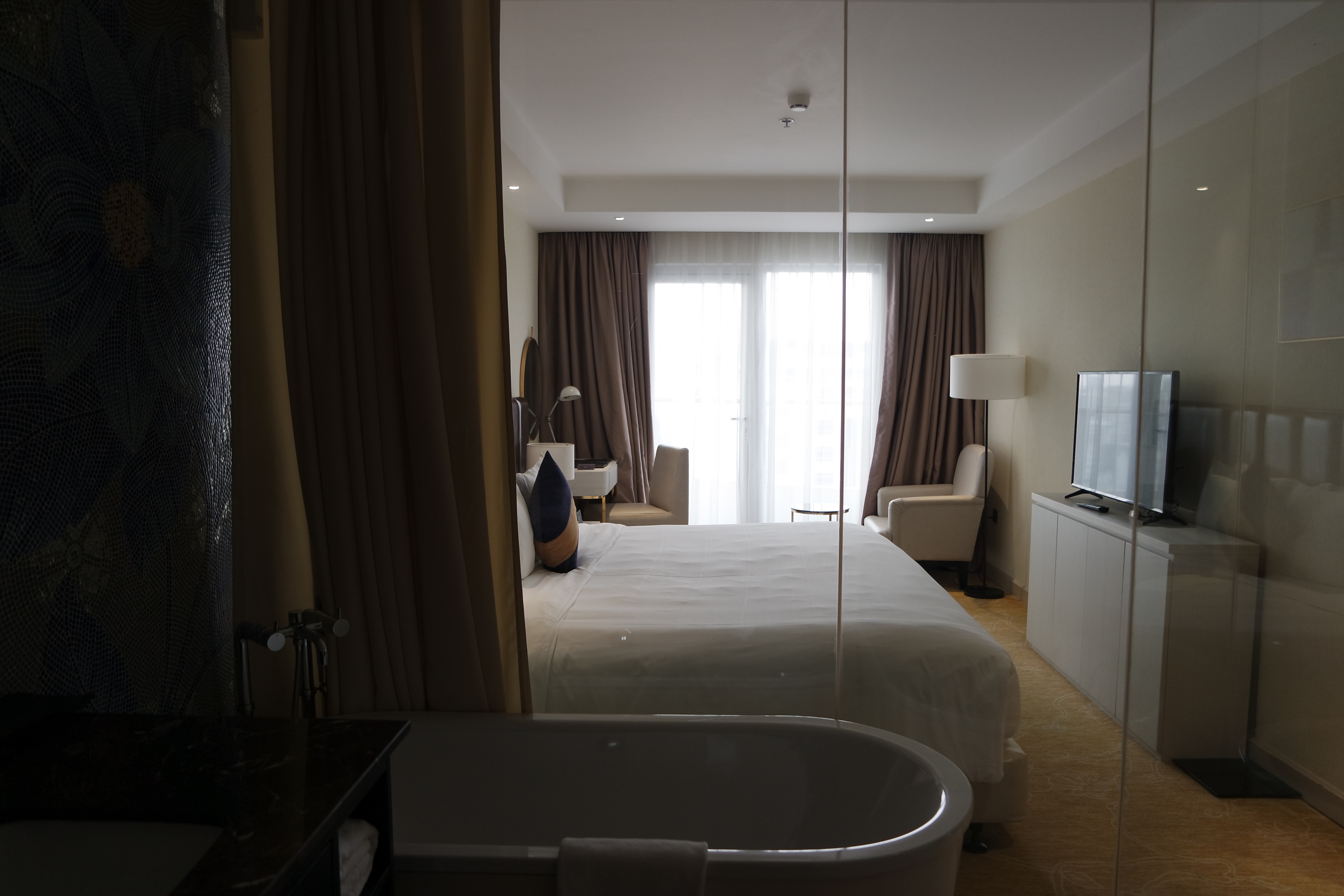 화장실이 통 유리로 되어 있어서 침실이 보이는 형태입니다. 베트남 호치민 호텔 숙소는 보통 통 유리로 되어 있는게 유행인가 봅니다. 더 해먹 벤탄 호텔에 갔을 때도 화장실이 통유리로 되어 있었습니다.